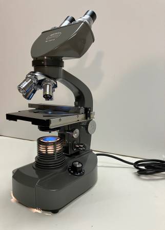PRICE REDUCED. This Wesco model 79319 Upright Compound Optical Medical Microscope offers a range of 40-1000x with a 10x eyepiece, providing detailed and clear imaging for various scientific and medical applications. Built-in adjustable lighting. Excellent microscope for high school- or college-level students as well as medical professionals. The upright microscope structure allows for easy observation and precise focusing, making it a reliable tool for professionals in research laboratories and healthcare settings. This microscope ensures high quality and performance for diverse microscopy needs. All Wesco original parts. Works perfectly. The microscope is in excellent, like new condition. Wooden storage/carrying case included (11" w X 11" d X 18" h).