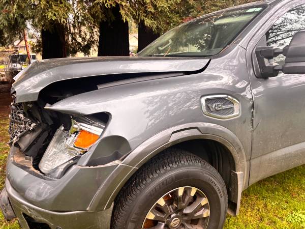 Nissan titan. Low miles. Was in a fender bender. Easy fix for the right person. Pink in hand. Tires in excellent shape & fully loaded. All leather interior. Over all the truck is like new except for front. Minor cosmetic damage. $12000 obo no low ballers please. Come check it out.